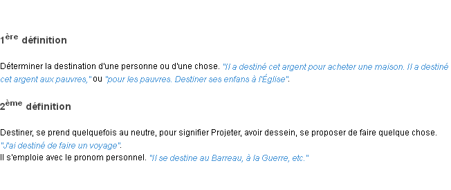 Ancienne signification issue du dico de l’Académie Française, parue en 1798.Merci à Gautier et Fiacre pour la numérisation du mot destiner.