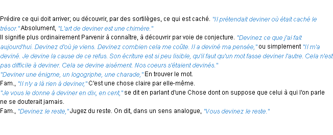 Ancienne signification éditée en 1798 pour le terme « deviner » par l’Académie Française.Merci à Perrine et Michèle pour la numérisation du mot deviner.