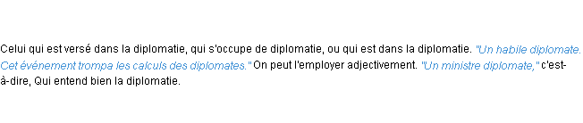 Signification éditée en 2010 par l’équipe de la-definition.fr.Merci à Andrée et Corin pour la numérisation du mot diplomate.
