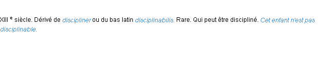 Ancienne signification parue en 1798 dans dictionnaire de l’Académie Française.Merci à Emmanuelle et Gautier pour la numérisation du mot disciplinable.