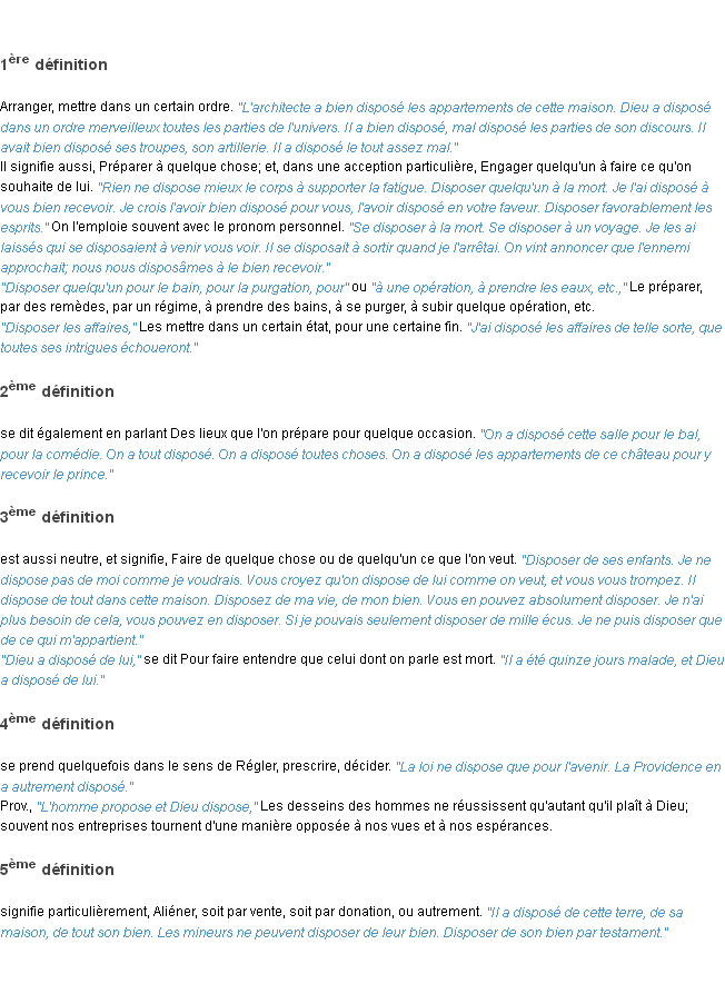 Ancienne signification issue du dico de l’Académie Française, parue en 1798.Merci à Sidonie et Mireille pour la numérisation du mot disposer.