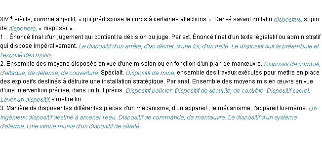 Ancienne définition développée dans dictionnaire académique, 1798.Merci à Claire et édouard pour la numérisation du mot dispositif.