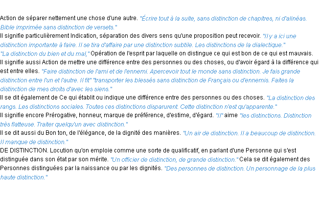 Ancienne signification issue du dico de l’Académie Française, parue en 1798.Merci à Dominique et Gratien pour la numérisation du mot distinction.