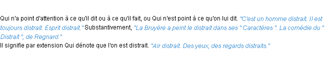 Définition du mot « distrait » par l’équipe de la-definition.fr (édition de 2011).Merci à Ambre et Apolline pour la numérisation du mot distrait.