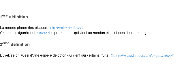 Ancienne signification issue du dico de l’Académie Française, parue en 1798.Merci à Luc et Hélène pour la numérisation du mot duvet.