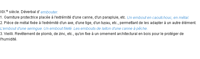 Définition d’Emile Littré (édition de 1876) pour le mot « embout ».Merci à Noel et Bénédicte pour la numérisation du mot embout.