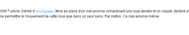Définition d’Emile Littré (édition de 1876) pour le mot « encliquetage ».Merci à Frédéric et Jérémie pour la numérisation du mot encliquetage.