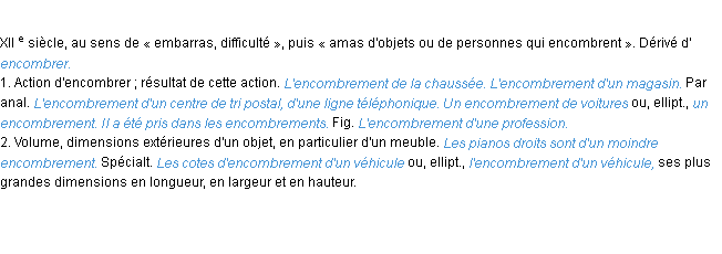 Ancienne signification du terme « encombrement », parution de 1798, dictionnaire académique Français.Merci à Gautier et Edmond pour la numérisation du mot encombrement.