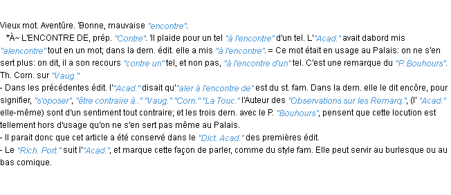 Définition développée dans dictionnaire de Jean-François Féraud (ancienne édition de 1788).Merci à Valérie et Lionel pour la numérisation du mot encontre.