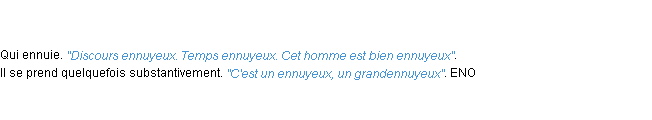 Ancienne signification développée en 1798 par l’académie Française (ACAD - 1798).Merci à Joelle et Chloé pour la numérisation du mot ennuyeux.