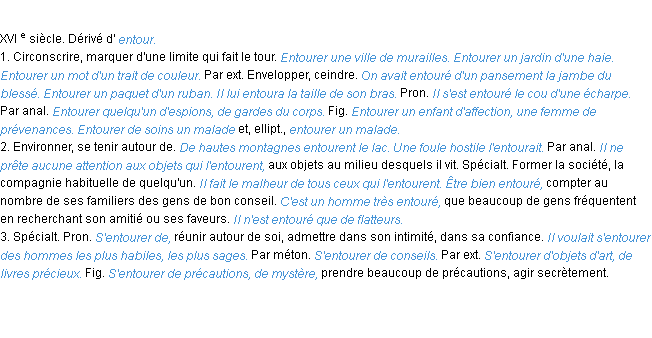 Ancienne définition de l’Académie Française (édition de 1798) pour le mot « entourer ».Merci à Ignace et Sylvianne pour la numérisation du mot entourer.