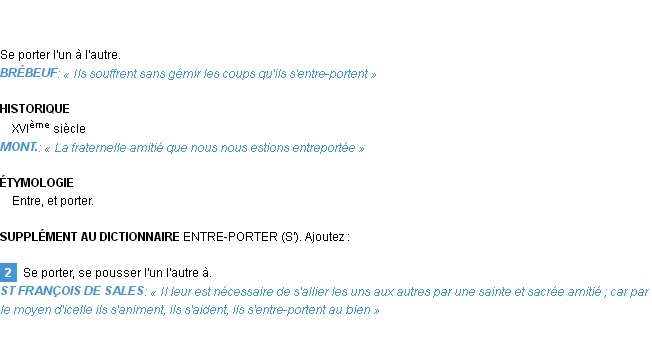 Signification développée en 1876 par Mr Littré (dictionnaire dit d’Emile Littré).Merci à Amaury et Fabrice pour la numérisation du mot entre-porter.