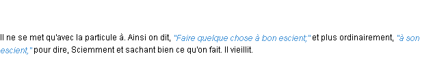 Définition de « escient » de source académique (Académie Française, parution de 1986).
