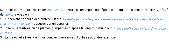Ancienne définition de l’Académie Française (édition de 1798) pour le mot « espalier ».Merci à édouard et Josette pour la numérisation du mot espalier.
