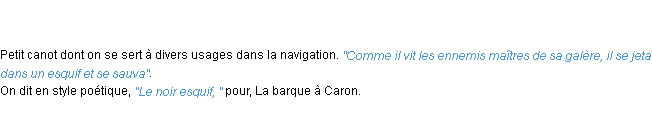Ancienne définition de « esquif » de source académique (Académie Française, parution de 1798).Merci à Faustine et Adèle pour la numérisation du mot esquif.