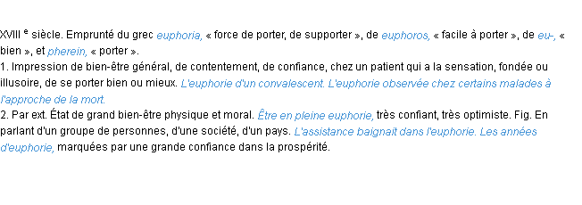 Définition du mot « euphorie » par l’équipe de la-definition.fr (édition de 2011).Merci à Jeannot et Firmin pour la numérisation du mot euphorie.