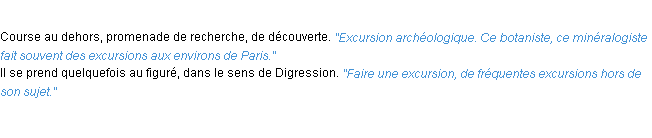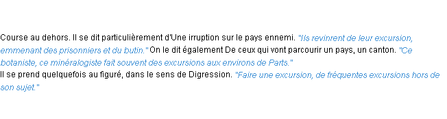 Ancienne signification développée en 1798 par l’académie Française (ACAD - 1798).Merci à Josette et Perceval pour la numérisation du mot excursion.