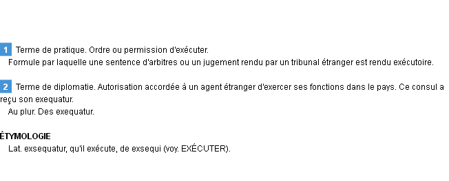 Signification du terme « exequatur », parution de 1986, dictionnaire académique Français.