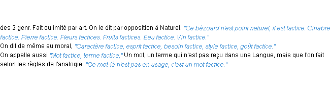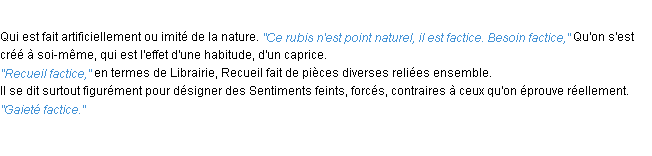 Ancienne définition académique pour le terme « factice » (parue en 1835).