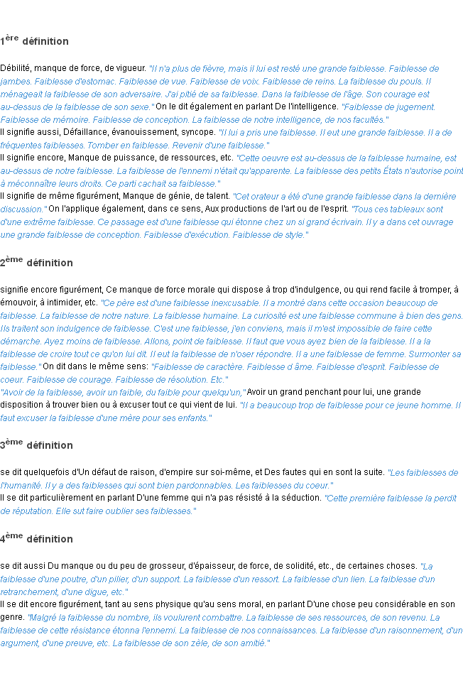 Définition de l’équipe de la-definition.fr (édition de 2009) pour le mot « faiblesse ».Merci à Joséphine et Baudouin pour la numérisation du mot faiblesse.