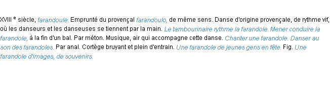 Signification développée en 1876 par Mr Littré (dictionnaire dit d’Emile Littré).Merci à Pascal et Henriette pour la numérisation du mot farandole.