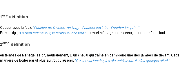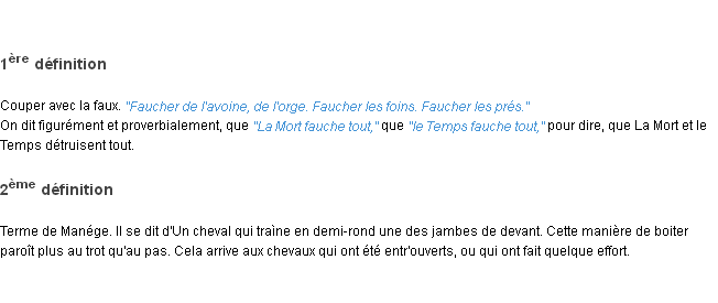 Ancienne définition « faucher » du dictionnaire académique Français, parution de l’année 1798.Merci à Arianne et Clémence pour la numérisation du mot faucher.