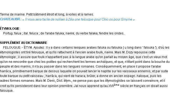 Définition du mot « felouque » par Emile Littré (édition de 1876).Merci à Serge et Jérémie pour la numérisation du mot felouque.