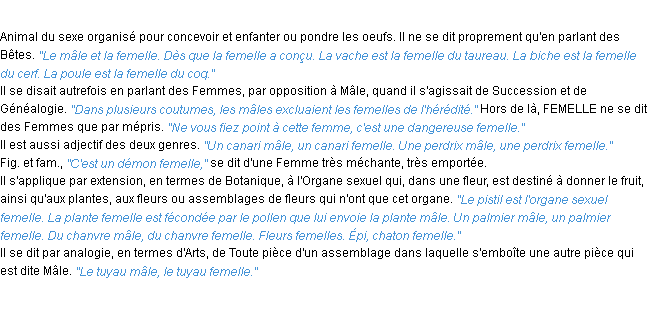 Ancienne signification du terme « femelle », parution de 1798, dictionnaire académique Français.Merci à Aurelien et Mariette pour la numérisation du mot femelle.