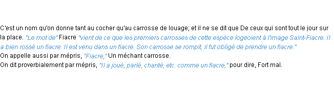 Ancienne signification développée en 1798 par l’académie Française (ACAD - 1798).Merci à Sidonie et Lunete pour la numérisation du mot fiacre.