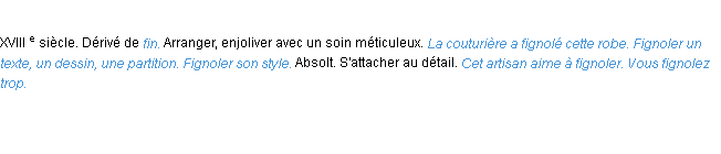 Définition d’Emile Littré (édition de 1876) pour le mot « fignoler ».Merci à Clémence et Jourdain pour la numérisation du mot fignoler.