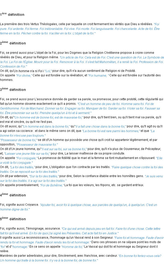 Ancienne définition « foi » du dictionnaire académique Français, parution de l’année 17962.Merci à Philippe et Luce pour la numérisation du mot foi.
