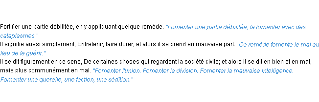 Ancienne définition de l’Académie Française (édition de 1835) pour le mot « fomenter ».