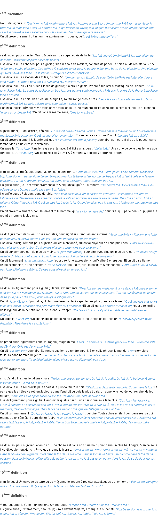 Ancienne signification éditée en 17962 pour le terme « fort » par l’Académie Française.Merci à Mathieu et Joelle pour la numérisation du mot fort.