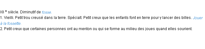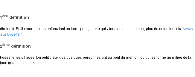 Ancienne signification parue en 1798 dans dictionnaire de l’Académie Française.Merci à Pascaline et Romain pour la numérisation du mot fossette.