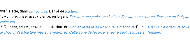 Définition de l’équipe de la-definition.fr (édition de 2009) pour le mot « fracturer ».Merci à Martine et Josette pour la numérisation du mot fracturer.