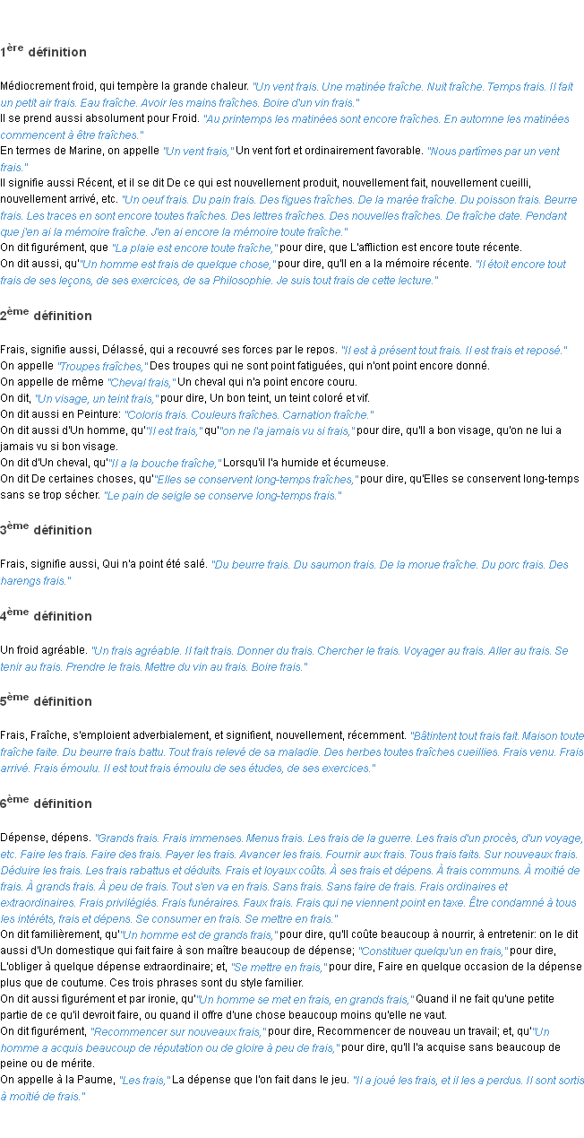 Définition « frais » du dictionnaire académique Français, parution de l’année 1932.