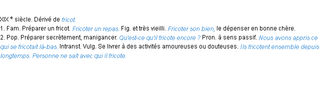 Définition développée dans dictionnaire d’Emile Littré (ancienne édition de 1876).Merci à Philippe et Yolande pour la numérisation du mot fricoter.