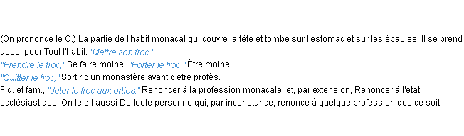 Ancienne signification parue en 1798 dans dictionnaire de l’Académie Française.Merci à Berthe et Armand pour la numérisation du mot froc.