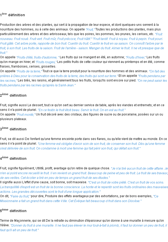 Ancienne signification éditée en 1798 pour le terme « fruit » par l’Académie Française.Merci à Hélène et Damien pour la numérisation du mot fruit.