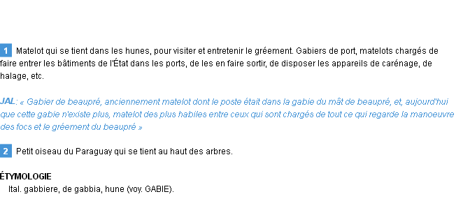 Signification développée en 1876 par Mr Littré (dictionnaire dit d’Emile Littré).Merci à Gérard et Lucille pour la numérisation du mot gabier.