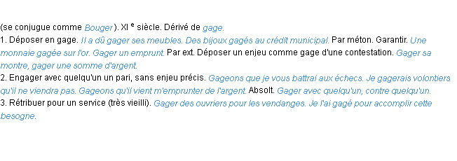 Ancienne définition de « gager » de source académique (Académie Française, parution de 1798).Merci à Baptiste et Didier pour la numérisation du mot gager.