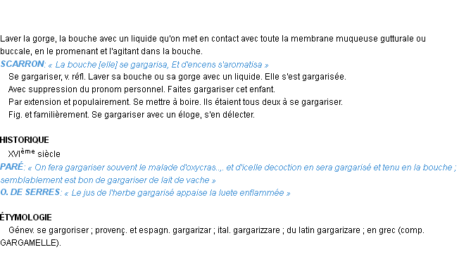Définition d’Emile Littré (édition de 1876) pour le mot « gargariser ».Merci à Baptiste et Sandrine pour la numérisation du mot gargariser.
