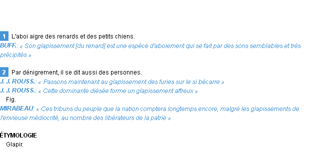 Définition d’Emile Littré (édition de 1876) pour le mot « glapissement ».Merci à Suzette et Alain pour la numérisation du mot glapissement.