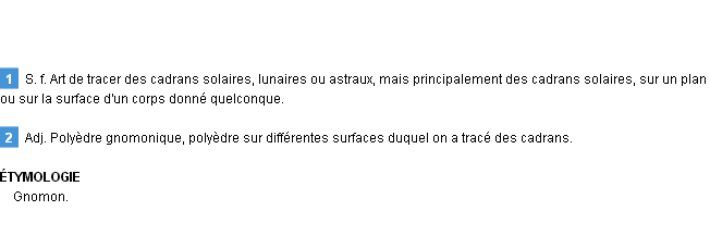 Signification développée en 1876 par Mr Littré (dictionnaire dit d’Emile Littré).Merci à Laurentine et Noella pour la numérisation du mot gnomonique.