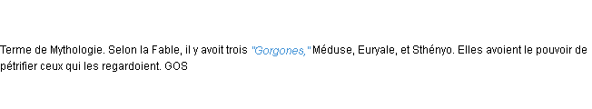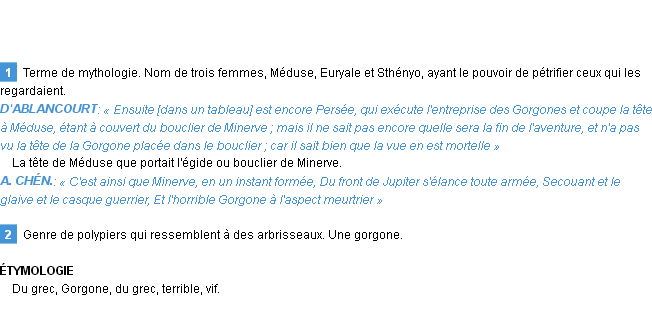 Définition de « gorgone » issue du Littré (Auteur Emile Littré, édité en 1876).Merci à Philippe et Perceval pour la numérisation du mot gorgone.