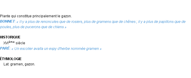 Définition développée dans dictionnaire d’Emile Littré (ancienne édition de 1876).Merci à Clementine et Sandrine pour la numérisation du mot gramen.