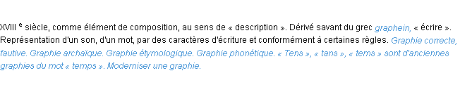 Définition du mot « graphie » par l’équipe de la-definition.fr (édition de 2011).Merci à Edwige et Amaury pour la numérisation du mot graphie.