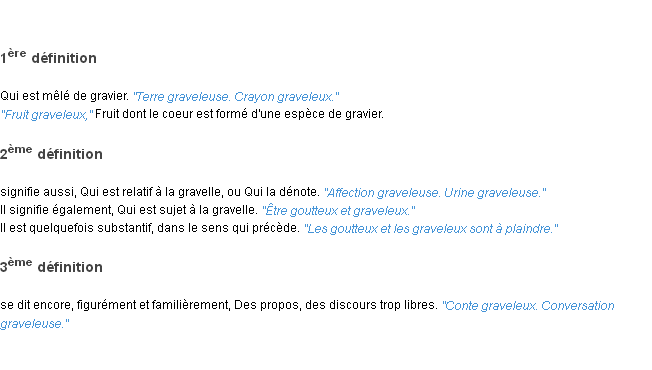 Ancienne définition académique pour le terme « graveleux » (parue en 1798).Merci à Josée et Barthélémy pour la numérisation du mot graveleux.