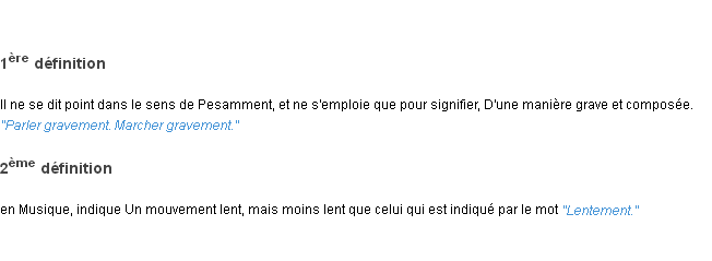 Ancienne signification du terme « gravement », parution de 1798, dictionnaire académique Français.Merci à Claire et Yolande pour la numérisation du mot gravement.