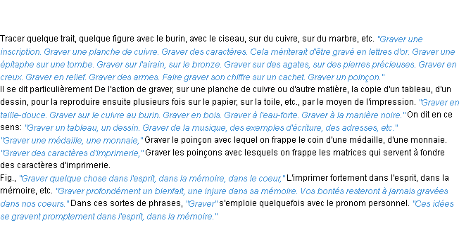 Ancienne définition de l’Académie Française (édition de 1798) pour le mot « graver ».Merci à Juste et Placide pour la numérisation du mot graver.